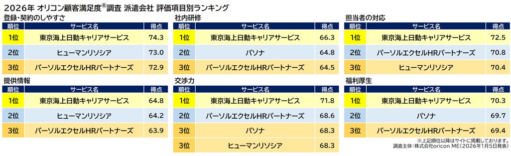 満足度の高い『派遣会社』『工場・製造業派遣』ランキング『派遣会社』 【東京海上日動キャリアサービス】が8年連続の総合1位「登録・契約のしやすさ」で10年連続の1位(オリコン顧客満足度®調査)
