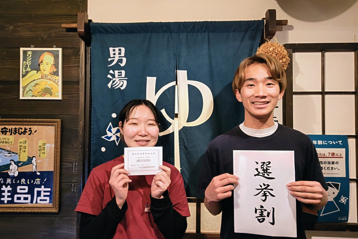 「おふろから文化を発信する」を企業理念に掲げる温泉道場では、この選挙割を行うことで、特に若い方たちに日本の政治・経済・社会の動向への関心を高めていただきたいと考えています。