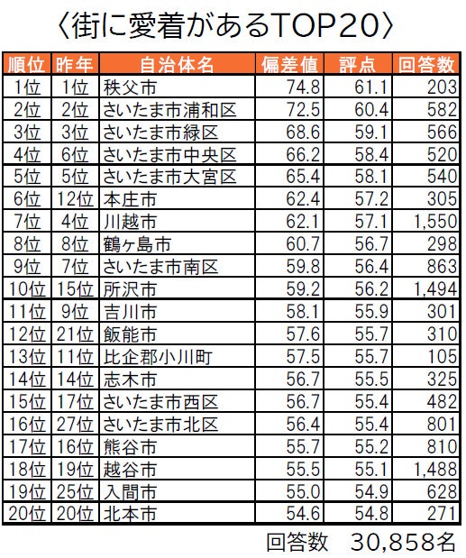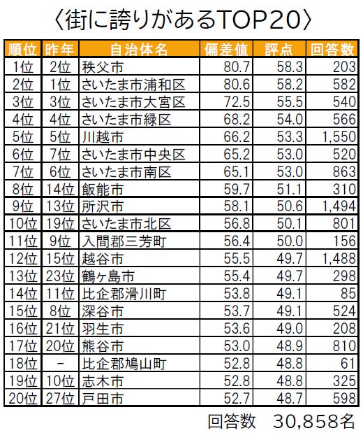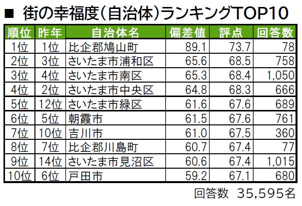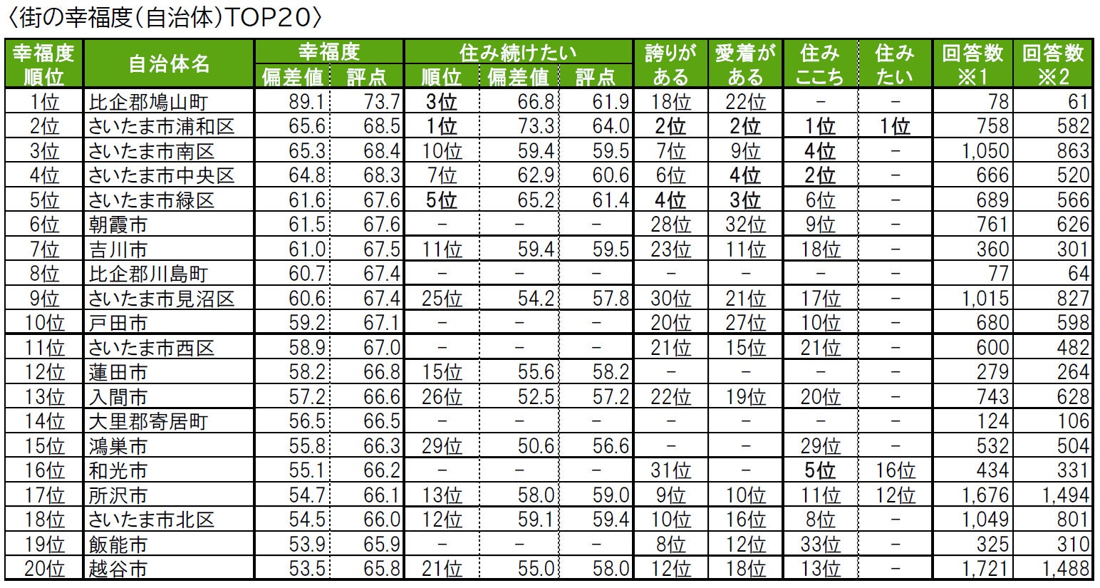 1位は2年連続でさいたま市浦和区で、「住みここち(自治体)」の「行政サービス」「親しみやすさ」の両因子で1位、「生活利便性」「防災」の両因子では2位の評価を得ています。2位も、2年連続で比企郡滑川町です。3位は、昨年は累計回答数が50名未満だったためランキング集計対象外だった比企郡鳩山町で、「街の幸福度(自治体)」では1位の町です。