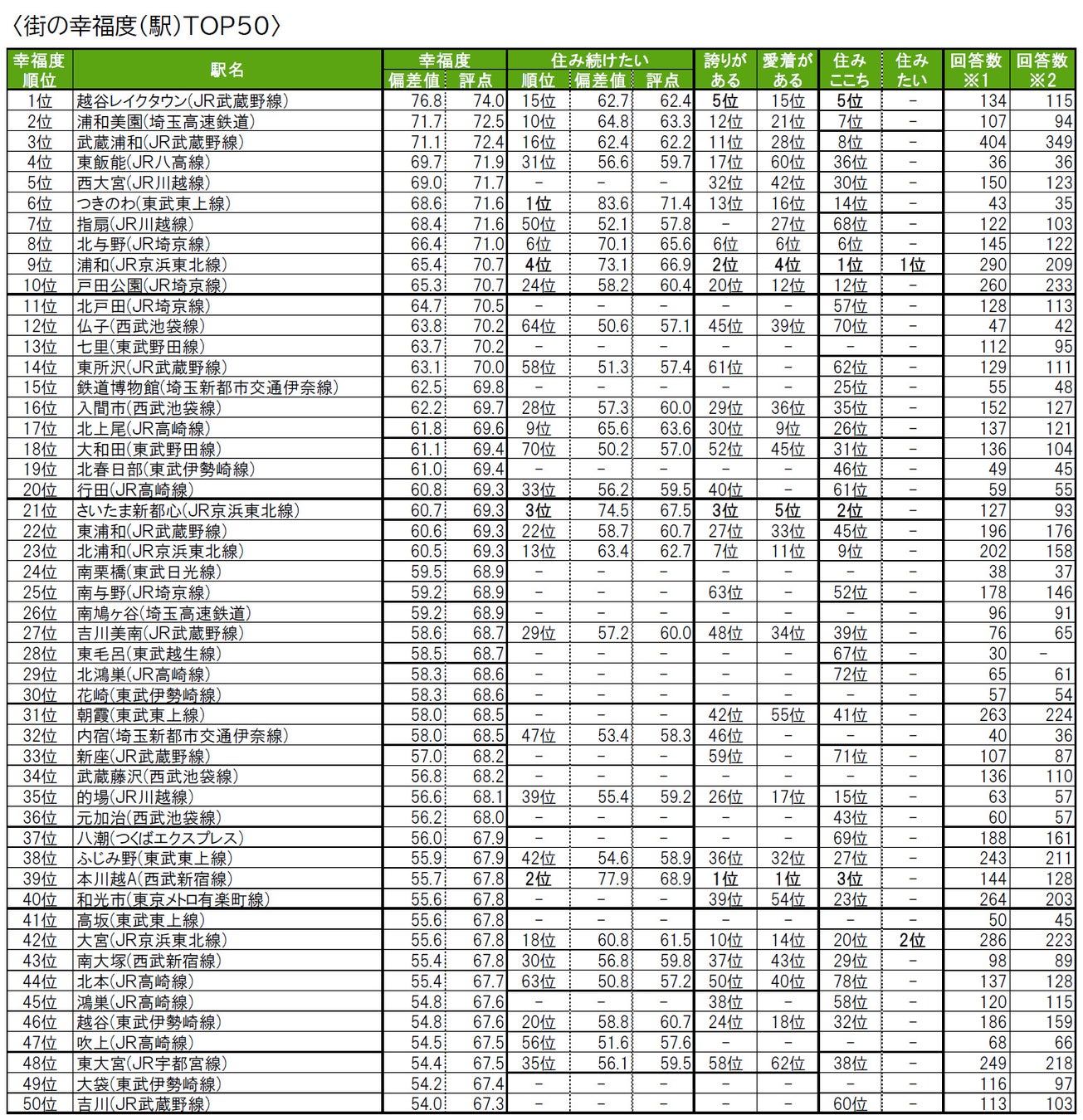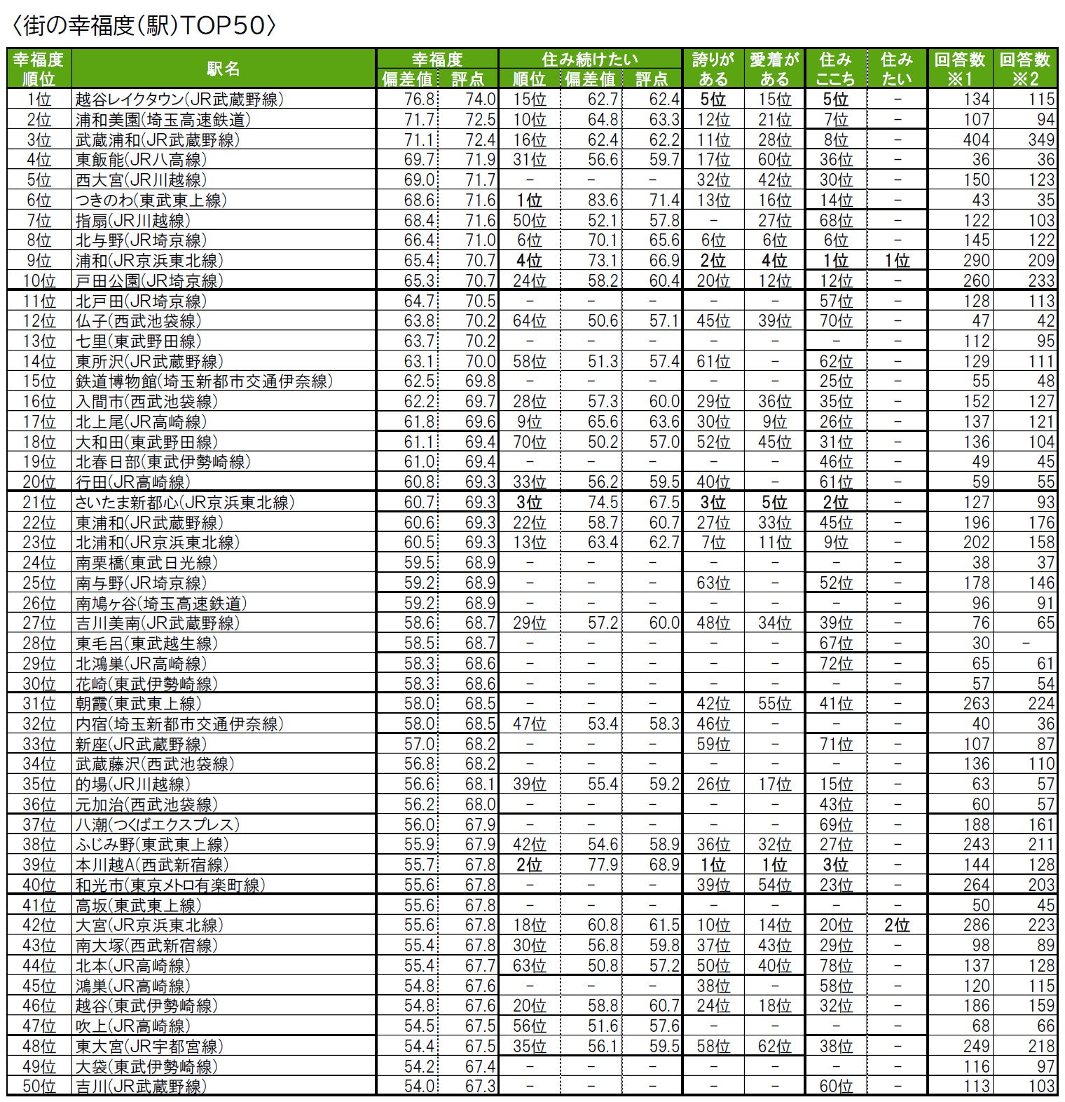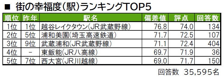 ■街の幸福度(駅)トップは、2年連続で越谷レイクタウン(JR武蔵野線)
