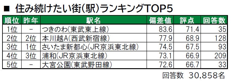 1位は、昨年は累計回答数が30名未満だったためランキング集計対象外だったつきのわです。2位は2年連続で本川越Aで、「住みここち(駅)」では3位の駅です。3位は昨年1位のさいたま新都心で、「住みここち(駅)」では2位の駅です。