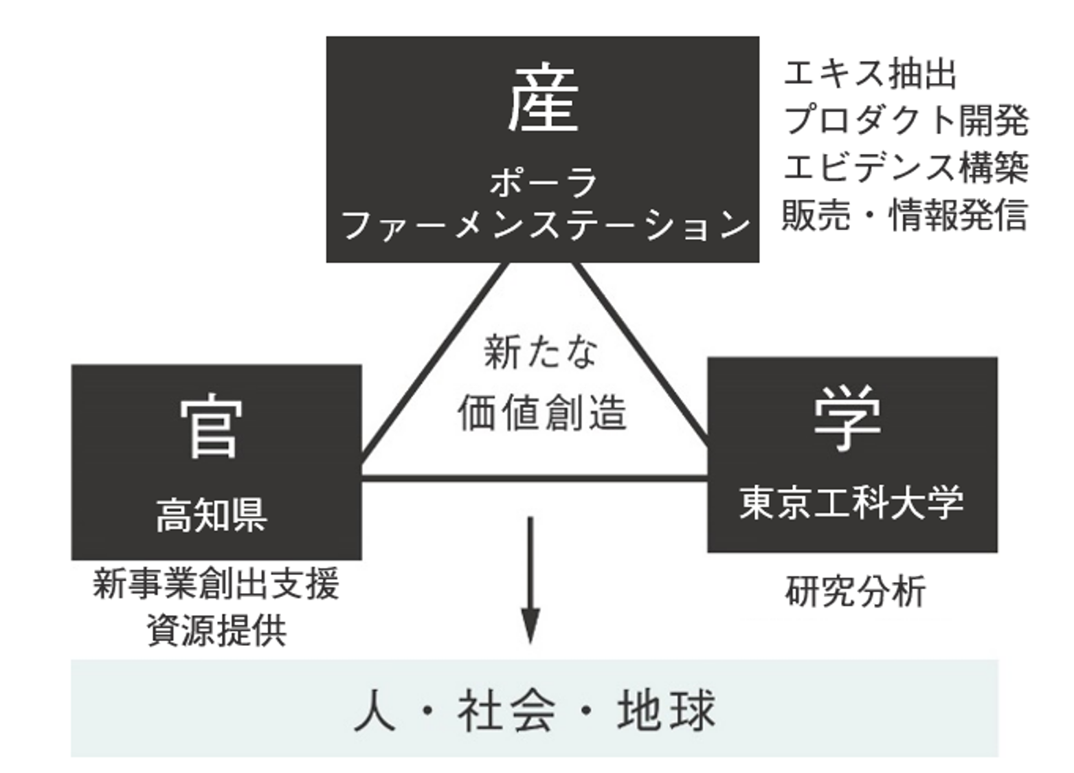 高知県は眠っていた資源の提供、ポーラは、発酵を通して未利用資源を活用し、サステナブルな循環社会をつくるという理念をもつファーメンステーションに共鳴し、ともにエキスの抽出やプロダクト開発を、そして東京工科大学はエキスの検証・分析と、産官学が連携して取り組みました。