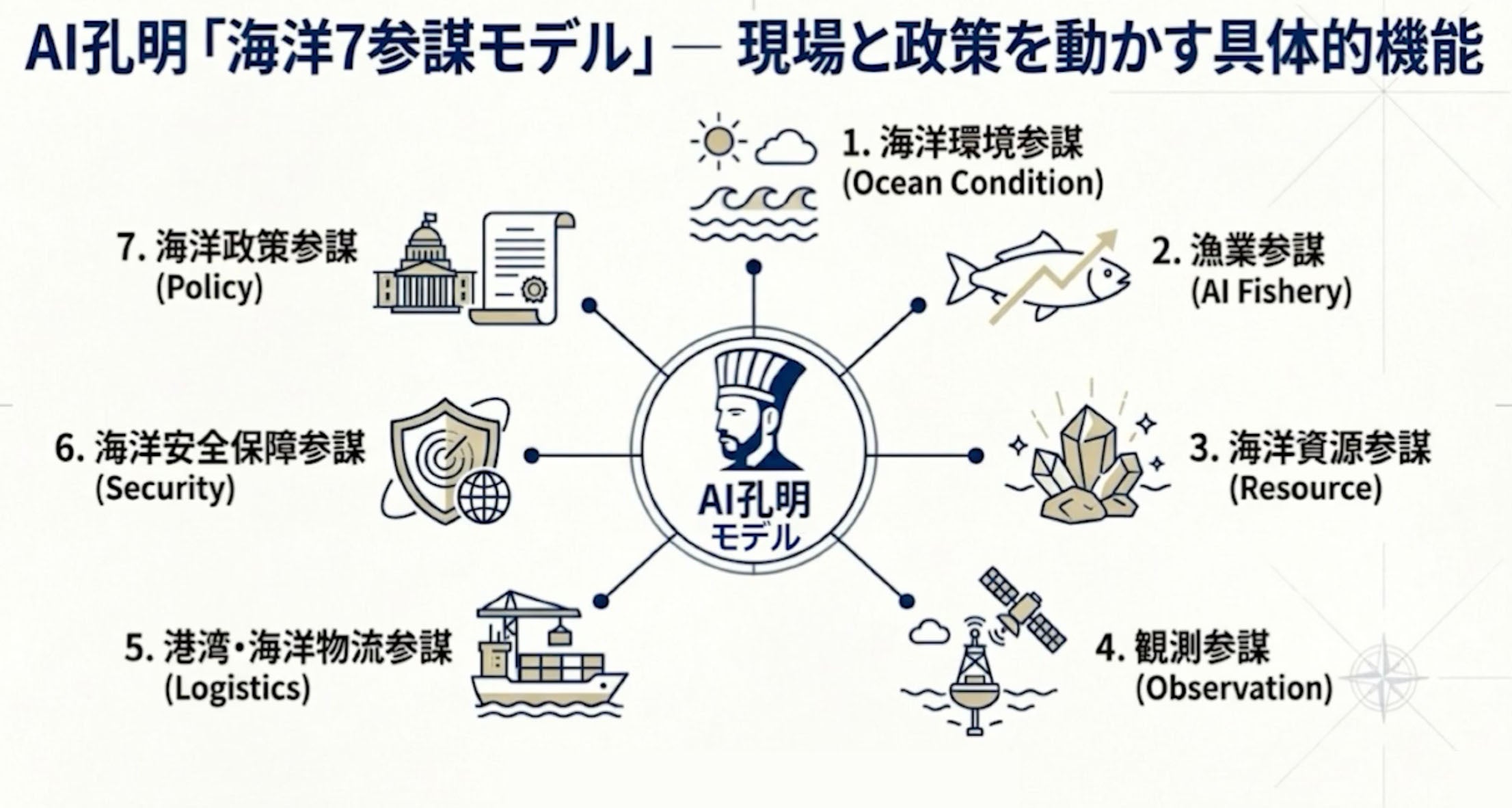 「AI OceanTech on IDX」は、海洋環境・漁業・資源・観測・物流・安全保障・政策の7領域において、分断された海洋データ(観測データ・漁獲記録・資源探査データ・安全保障情報・政策文書)を統合・構造化し、現場の業務効率化から国家レベルの政策意思決定までを一貫して支援する 「7参謀AI統合プラットフォーム」 です。