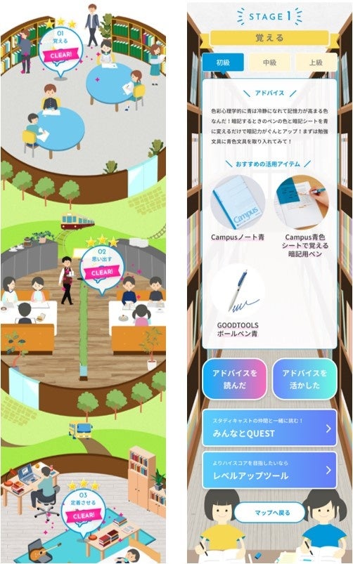 今回、夏休み明けの授業再開に伴い、学校の課題や部活、塾などで忙しい学生の効率的な学習をサポートすることを目的に、「今日からすぐに使えるコツ」として暗記をテーマにした特設ステージを追加します。ベネッセが提供する学習管理アプリ「StudyCast(スタディキャスト)」のユーザーに対し実施した「定期テストでの困りごとに関するアンケート」(※)では、3人に1人がテスト対策時「重要事項や単語を暗記できない」といった暗記に対する困りごとを抱えていることが分かりました。そこで、記憶を効率的に定着させる暗記のコツである「覚える」「思い出す」「定着させる」の3ステップに沿った3つのステージを用意しました。それぞれのステージでは、上級、中級、初級とレベル別にベネッセの監修による今日から使える暗記のコツや、コクヨおすすめの暗記に役立つ文具を提案します。