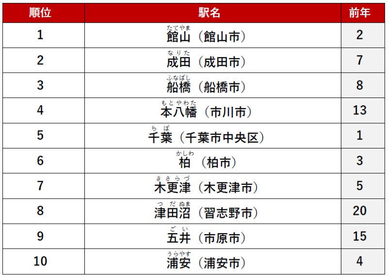 2位に「船橋」駅、3位に「千葉」駅がランクインしました。
