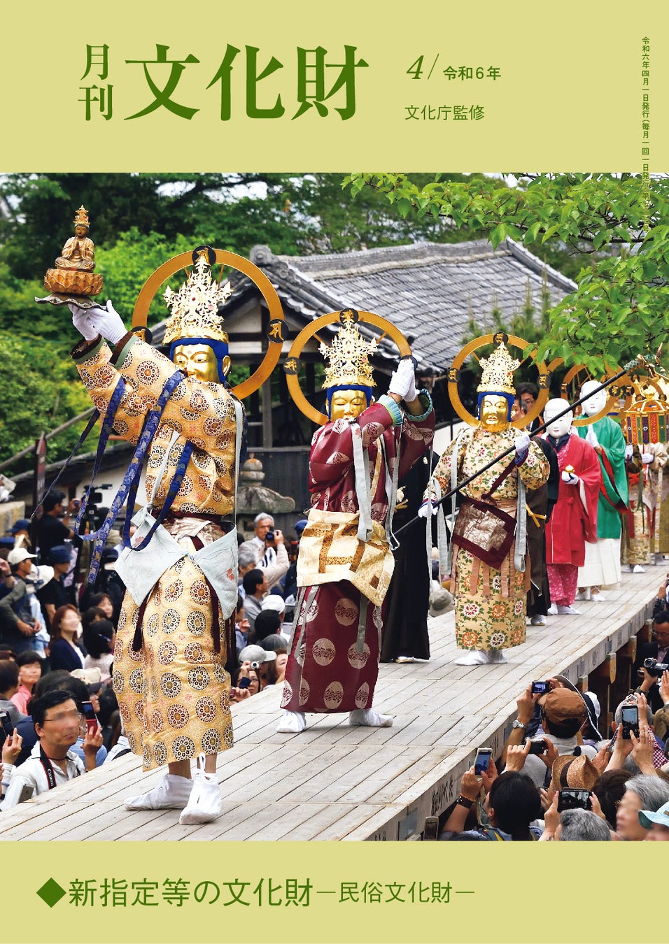 4月号では、當麻寺練供養や小豆島農村歌舞伎等の新指定の民俗文化財、島根半島沿岸及び宍道湖・中海の漁撈用具等の新登録の民俗文化財、綾部八幡神社の旗上げ・旗下ろし行事等の新選択の民俗文化財を特集!