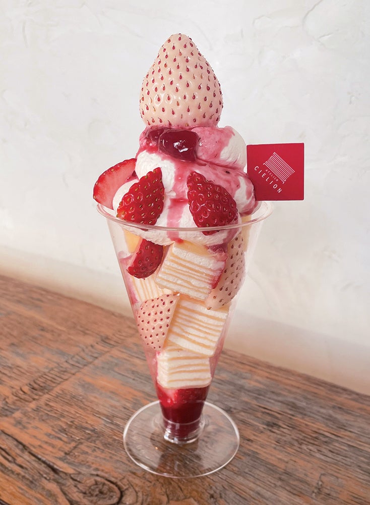 〈A telier Cielion 〉金谷 桃子さん考案。ミルクレープの美しい層がほどけていく、口あたりと繊細な味わいに、旬のイチゴで甘酸っぱさを!
