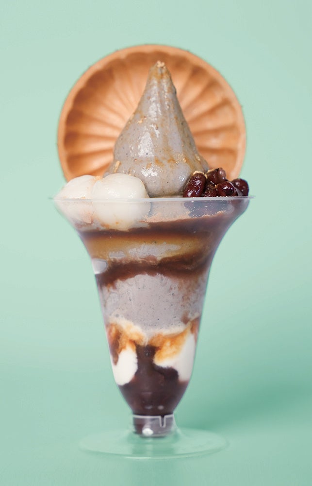 〈K.L.I.M 〉森 遥夏さん考案。黒ごまソフトや黒蜜、きなこ、モナカ、あずきなど、和テイスト大好き女子にぴったりのパフェ。