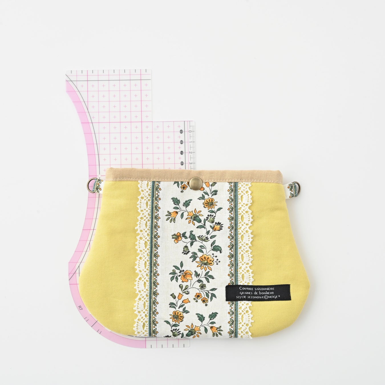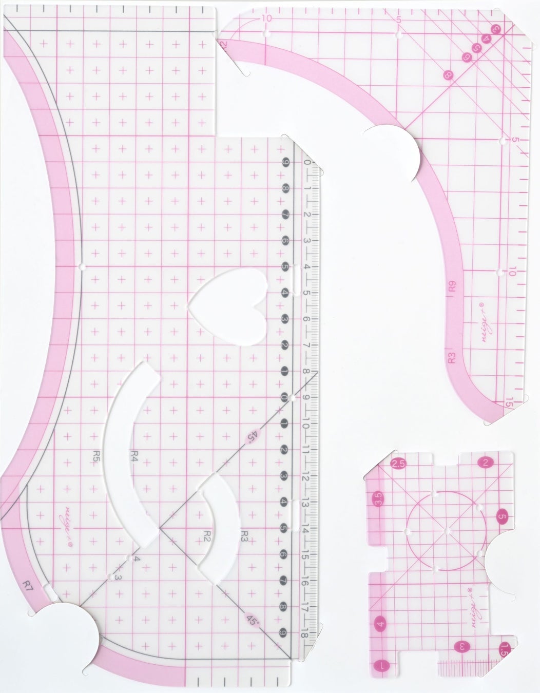 人気作家neige+こと猪俣友紀さんデザインの定規3点が付録についています。0.75mm厚でいちばん大きなくびれ定規は、直線はもちろん、カーブを描いたり、ダーツの印つけに便利な型抜き入り。中サイズのカーブ定規は0.5mm厚で、半径9cmのカーブや直角線を描くのに最適。さらに三角まちの印つけに便利な印が入っています。ミニサイズのカード定規は0.5mm厚。5mmの方眼線が入り、縫い代を測るのに便利。