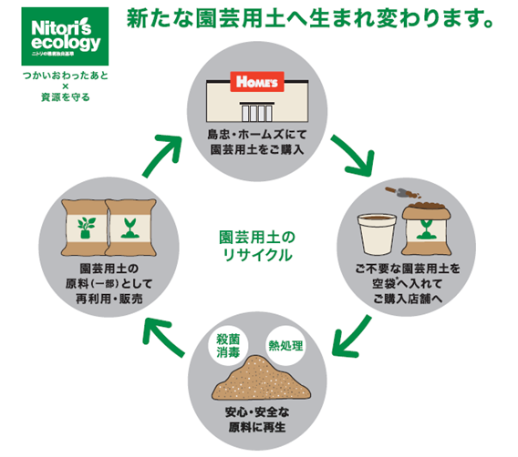 ニトリグループが推進する環境に配慮したものづくり・取組み「Nitori’s ecology」の一環として、「園芸用土のリサイクル回収」の取り組みを、積極的に推進。