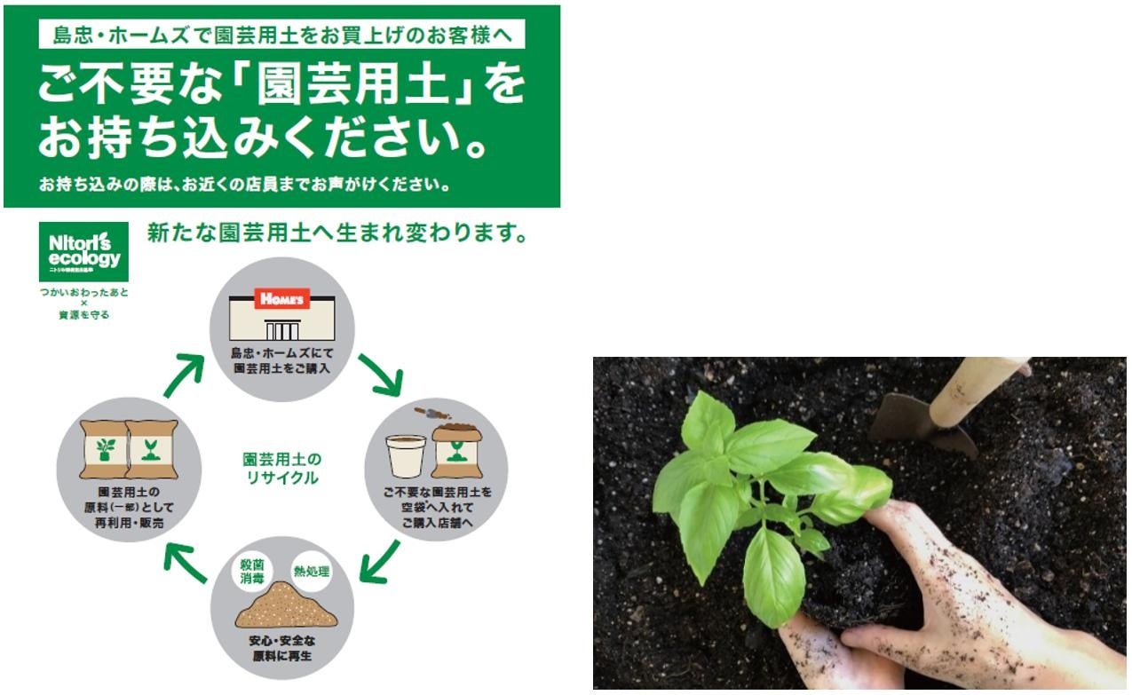 本取り組みは、島忠・ホームズ・ニトリホームズ店舗にてご購入いただきご不要となった園芸用土を、ご購入時の空袋に戻して回収実施店舗にお持ち込みいただくと、島忠が専門のリサイクル施設にて熱処理・殺菌消毒し、新たな園芸用土の原料として生まれ変わらせるというものです。お客様の困りごとを解決すると同時に、循環させることで限りある資源を守ります。