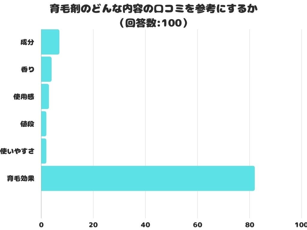 育毛剤のどんな内容の口コミを参考にするかをアンケートにて調査したところ、1位は「育毛効果」でした。