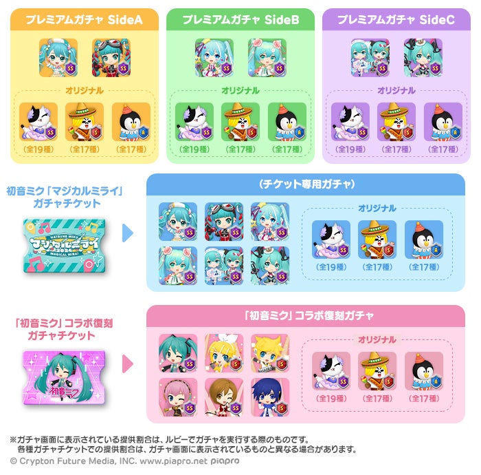 プレミアムガチャに、2019年から2024年開催『初音ミク「マジカルミライ」』歴代衣装の『初音ミク』が限定なかまとして登場します。このプレミアムガチャは、ゲーム内の各種イベントの報酬としてもらえる「初音ミク「マジカルミライ」ガチャチケット」でも引くことができます。