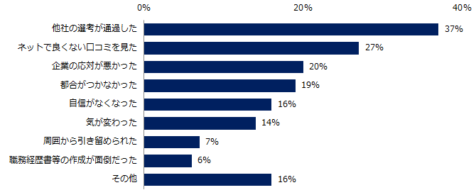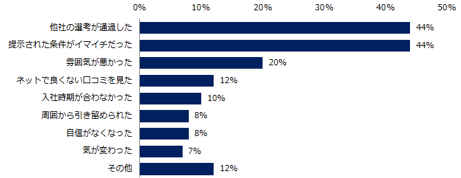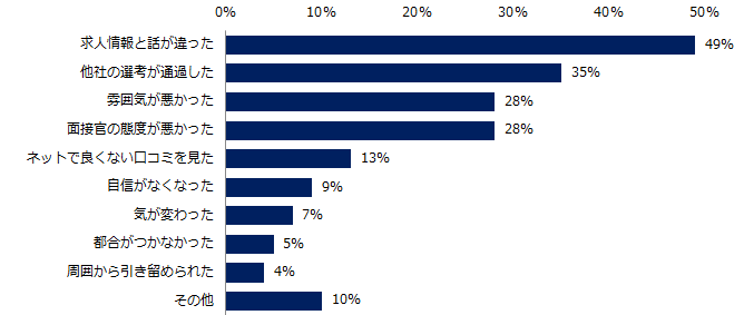面接前に選考を辞退した方に理由を伺うと、トップ3は「他社の選考が通過した」(37%)、「ネットで良くない口コミを見た」(27%)、「企業の応対が悪かった」(20%)でした。また面接後に選考を辞退した理由、第1位は「求人情報と話が違った」(49%)。内定取得後に選考を辞退した理由、第1位は「他社の選考が通過した」「提示された条件がイマイチだった」(それぞれ44%)でした。