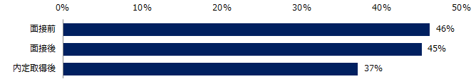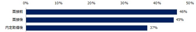 選考辞退の経験者に辞退したタイミングを伺うと、「面接前」は46%、「面接後」は45%、「内定取得後」は37%でした。