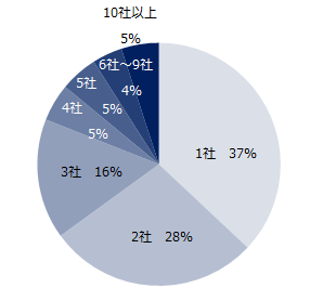 選考辞退の経験者に辞退した社数を伺うと、37%が「1社」と回答。「2社以上」は63%(2社:28%、3社:16%、4社:5%、5社:5%、6社~9社:4%、10社以上:5%)でした。