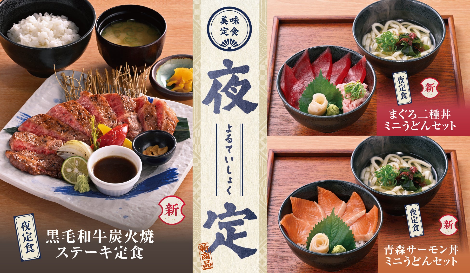 また、近年高まりを見せている“一人でもしっかりと食べたい”というニーズにお応えするため、千年の宴では「夜定食」シリーズをスタートします。黒毛和牛を炭火(※5)で焼き上げる「黒毛和牛炭火焼ステーキ定食 2,980円(税込3,278円)」や、“丼ぶり”と“麺”を両方楽しむことができる「青森サーモン丼 ミニうどんセット1,080円(税込1,188円)」「まぐろ二種丼 ミニうどんセット1,080円(税込1,188円)」を用意し、夜のお食事を贅沢に彩ります。