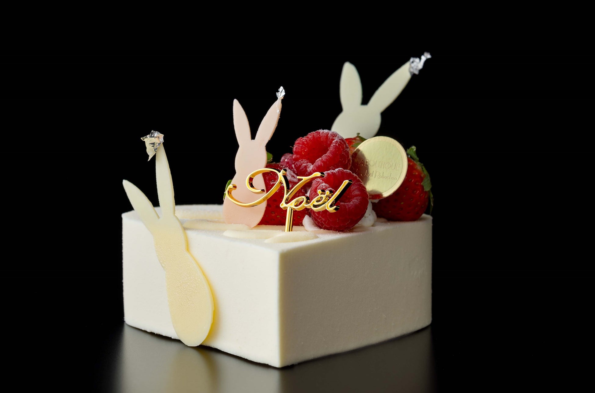 特徴:雪ウサギをあしらったハート形のかわいらしいクリスマスケーキです。雪の中で遊んでいるウサギをイメージしています。ミルキーな優しい甘さのホワイトチョコレートムースに甘酸っぱいラズベリーのジュレを閉じ込め、ヘーゼルナッツのサブレで食感を加えた、毎年人気のクリスマス限定ケーキです。