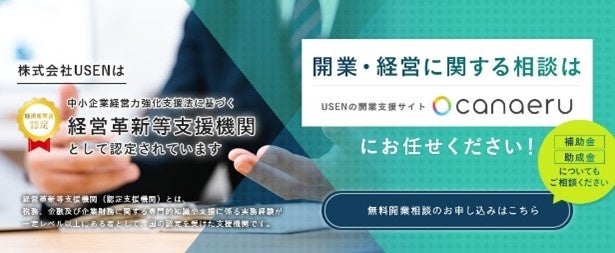 当社では、開業を準備されている方々に向け、開業支援サイト「canaeru(カナエル)」(https://canaeru.usen.com)にて主に飲食店の開業に関する情報の提供と、開業に関する無料相談やセミナーの開催などの開業サポートを実施しています。