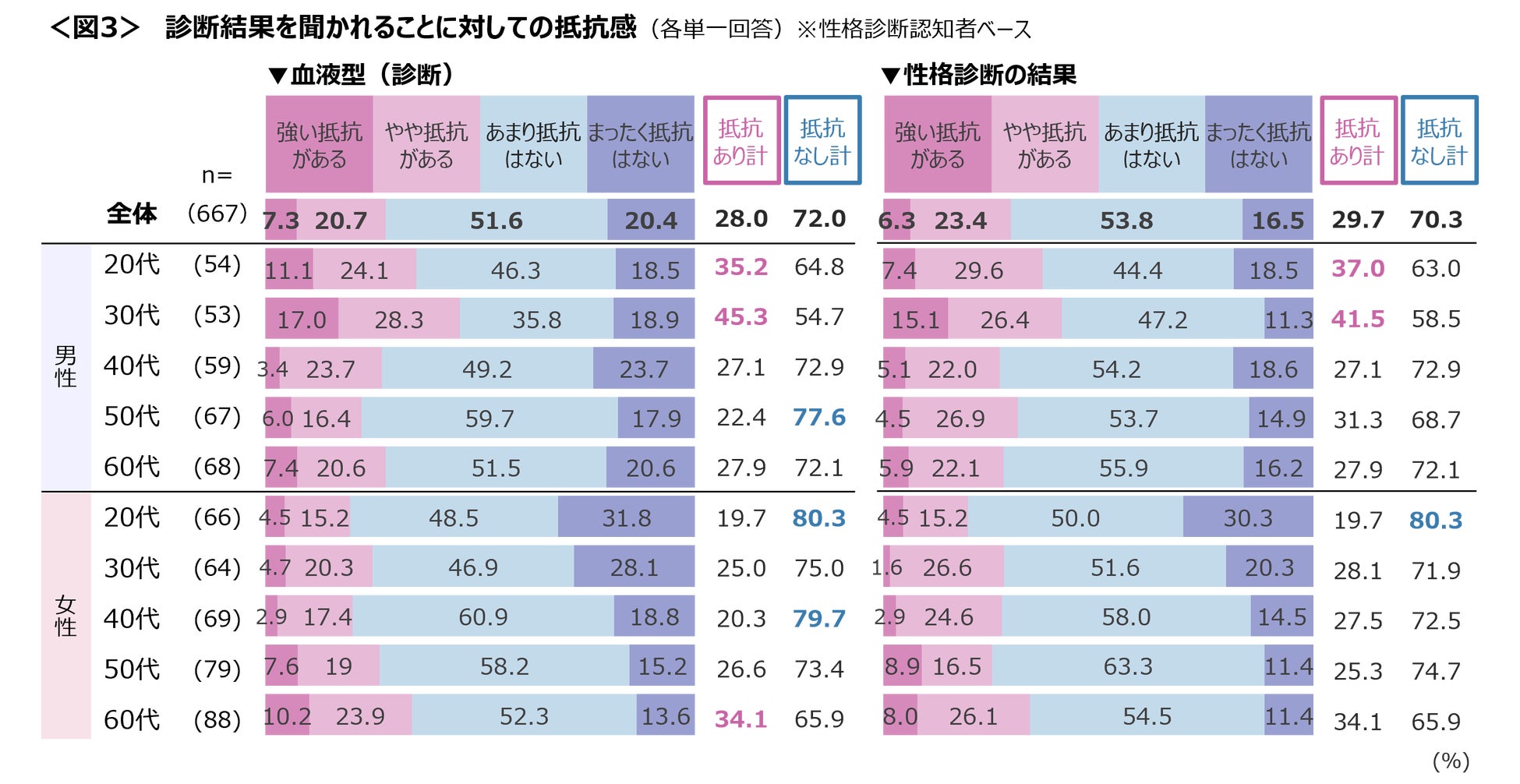 血液型・性格診断の結果を人に聞かれることについて、ともに「抵抗なし」が約7割で大きな差はみられなかった。