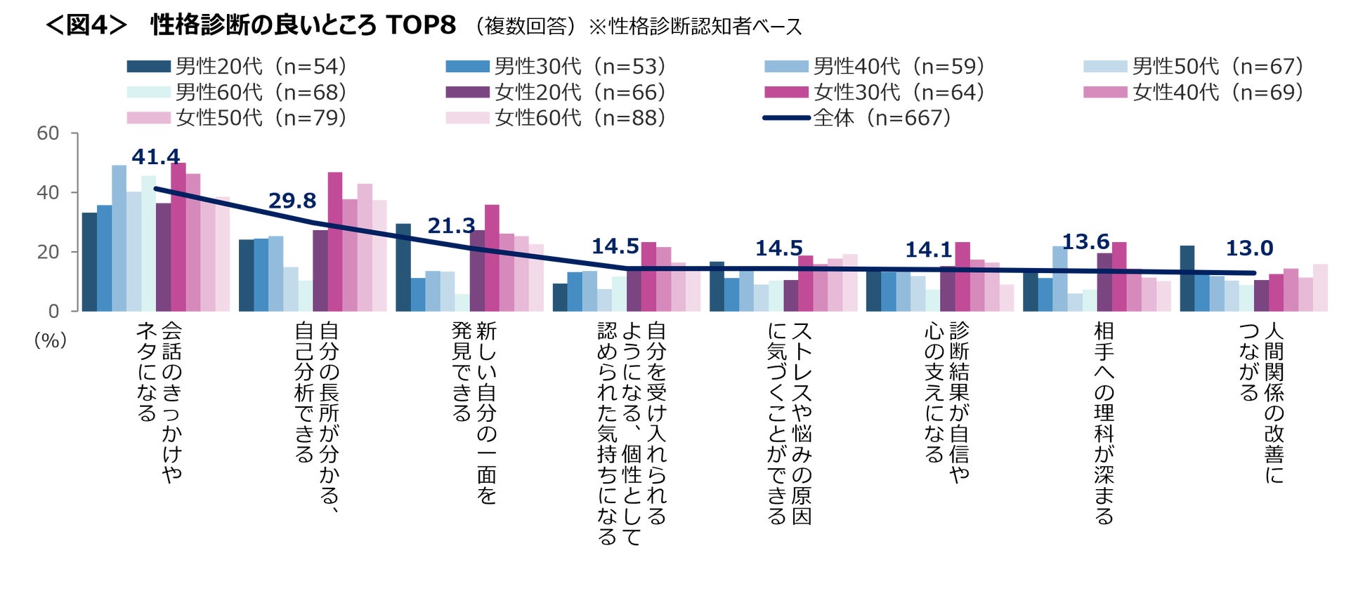 性格診断の良いところは「会話のきっかけやネタになる」「自分の長所が分かる、自己分析できる」がTOP2。