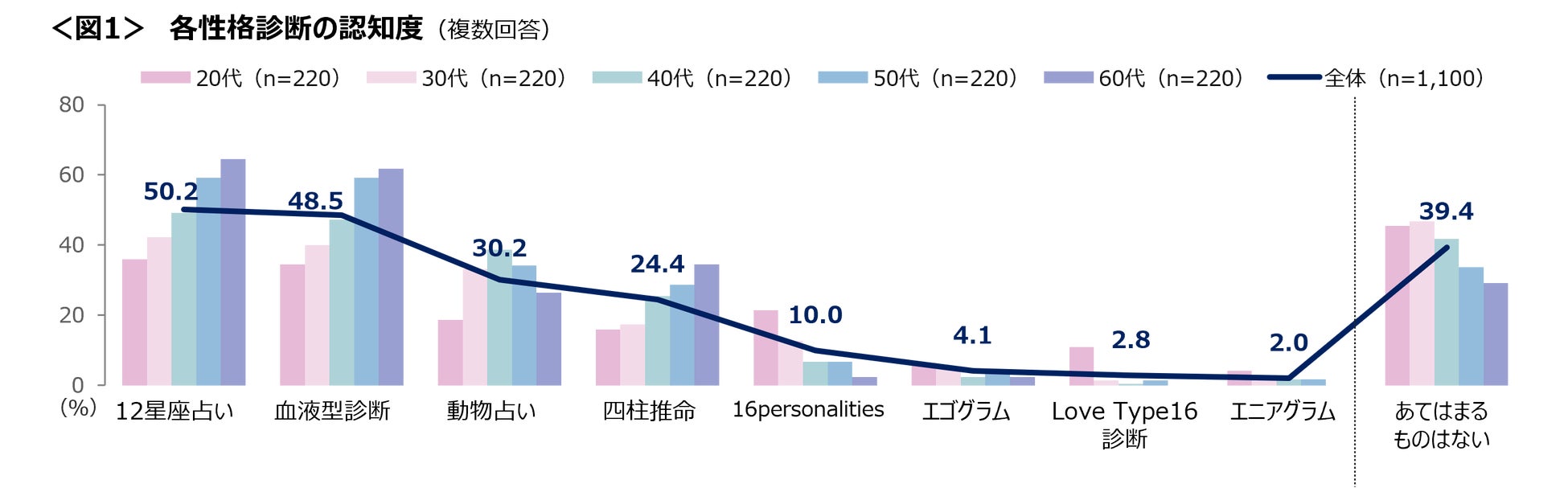 「12星座占い」「血液型診断」「四柱推命」は年代が上がるほど認知率も高まる。20代は「16personalities」「Love Type16診断」が高い。<図1>