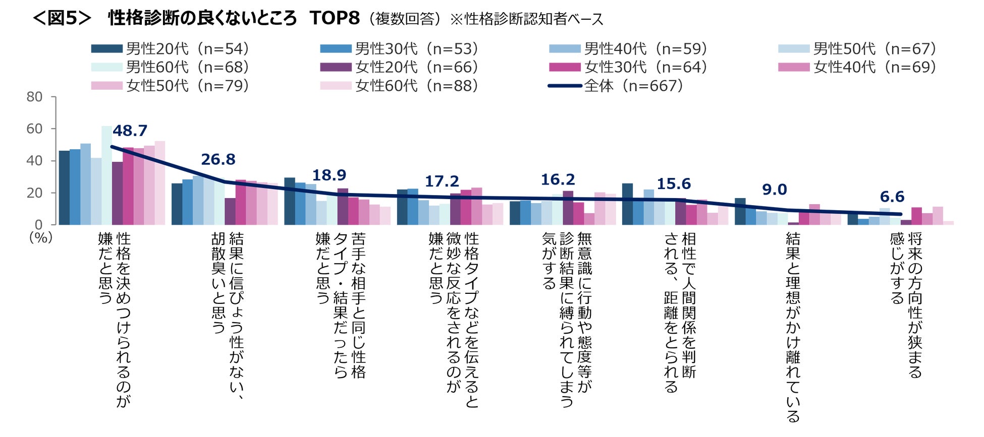 男性60代は「性格を決めつけられるのが嫌だと思う」が6割と高い。男性20代は「苦手な相手と同じ性格タイプ・結果だったら嫌だと思う」「相性で人間関係を判断される、距離をとられる」「結果と理想がかけ離れている」など、ネガティブに感じていることが多い。<図5>
