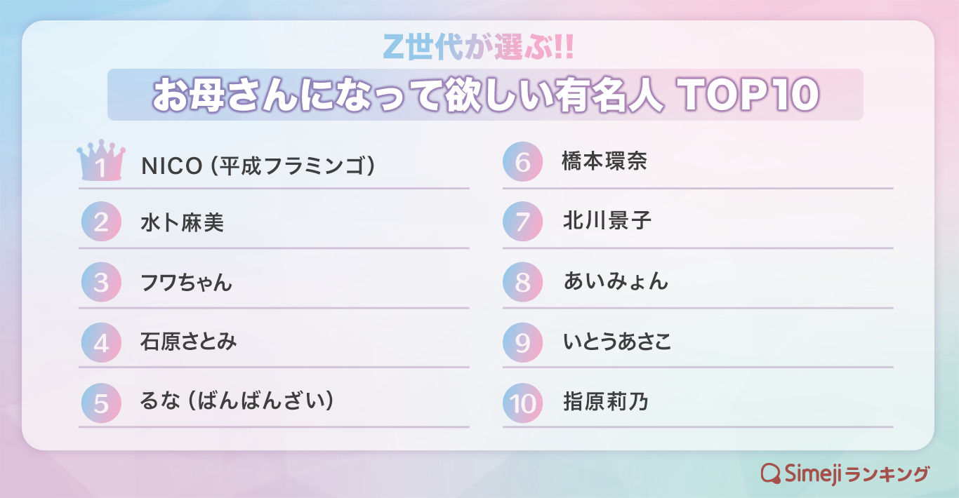 【Simejiランキング】Z世代が選ぶ!!「お母さんになって欲しい有名人TOP10」