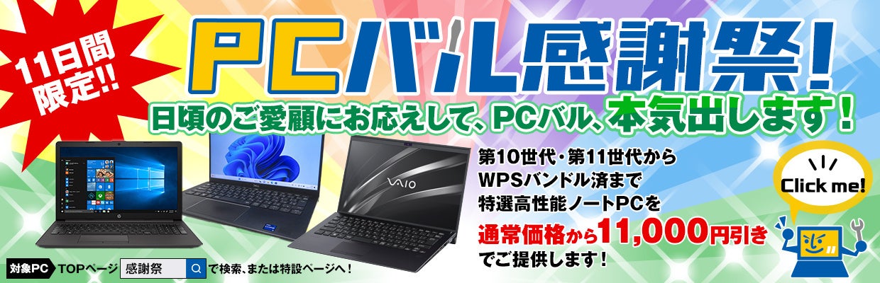 中古パソコン販売の「PCバル」、日頃のご愛顧にお応えするため感謝祭を11日間限定で開催!第10世代・11世代やWPSバンドル済など、特選高性能ノートパソコンを通常価格から¥11,000引きでご提供!