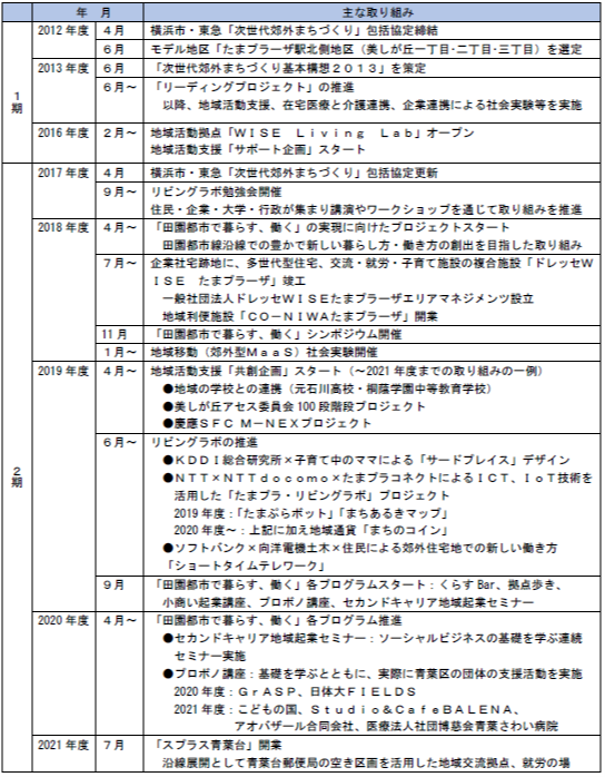 協定締結から10年間、モデル地区である「たまプラーザ駅北側地区(横浜市青葉区美しが丘一、二、三丁目)」を中心に、「田園都市で暮らす、働く」の実現に向けて、地域活動の支援や交流・就労機能等の整備、起業支援、「プロボノ(※)」による地域課題の解決などを推進してきました。2021年7月には、青葉台駅周辺に交流と就労の機能が併設・連携した施設を整備するなど、モデル地区以外の地域にも取組を展開しています。(別紙1参照)