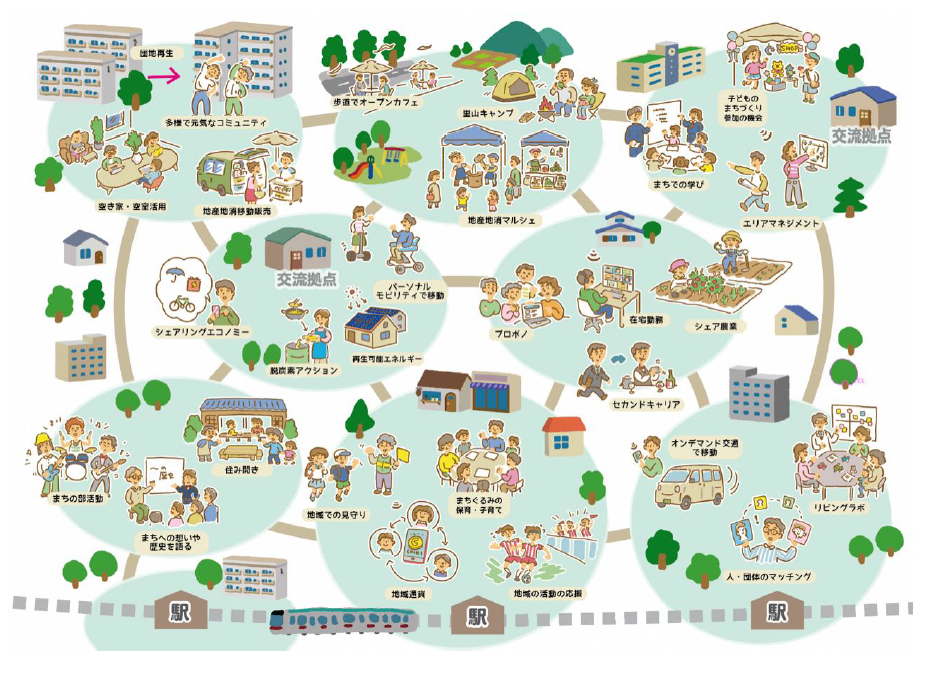 歩いて暮らせる範囲に、買い物、福祉、医療、子育て、コミュニティ活動など、地域に必要な機能を適切に配置し、それらを密接に結合させていく考え方で「次世代郊外まちづくり」を進める上で、主要な理念として位置付けています。