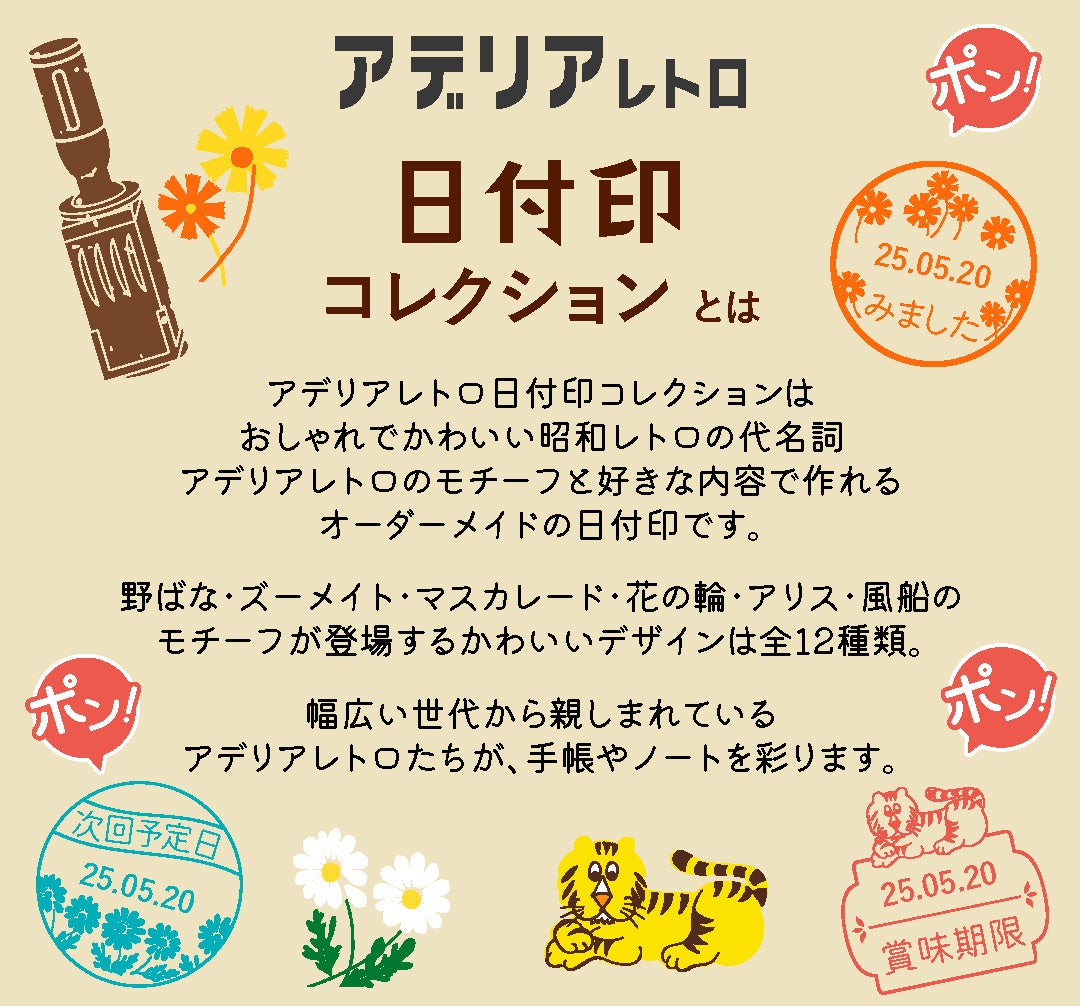幅広い世代に愛される昭和レトロの代名詞・アデリアレトロのモチーフと好きな内容で作れるオーダーメイドの日付印「アデリアレトロ 日付印コレクション」。