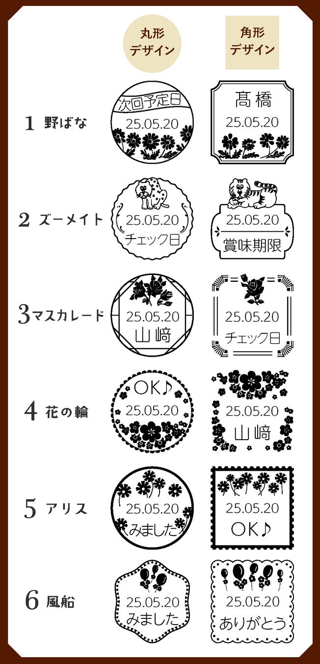 幅広い世代から愛される、レトロかわいいデザインは全12種類。野ばな・ズーメイト・マスカレード・花の輪・アリス・風船といったモチーフから、丸形・角形が選べます。