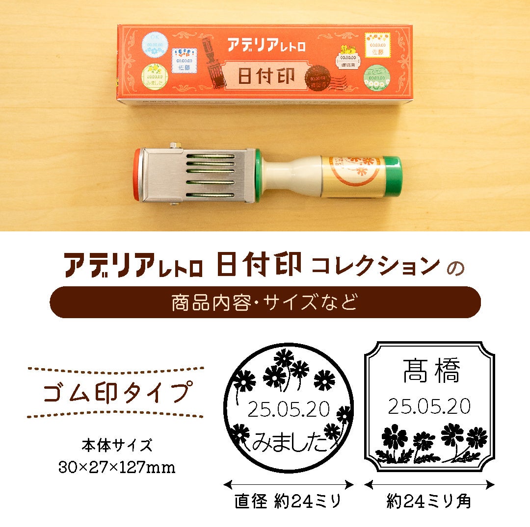 日付印本体のサイズは横30×縦27×高さ127ミリ。印面サイズは丸形・角形ともに約24ミリ。スタンプ本体の持ち手部分や専用BOXにも、アデリアレトロのかわいいモチーフがあしらわれています。