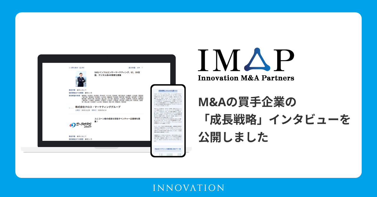 株式会社イノベーション(東証グロース 証券コード3970)のグループ会社である、株式会社Innovation M&A Partners(本社:東京都渋谷区、代表取締役社長:荒木 尚二郎、以下「当社」)は、M&A買手企業の独自インタビューを公開したことをお知らせいたします。