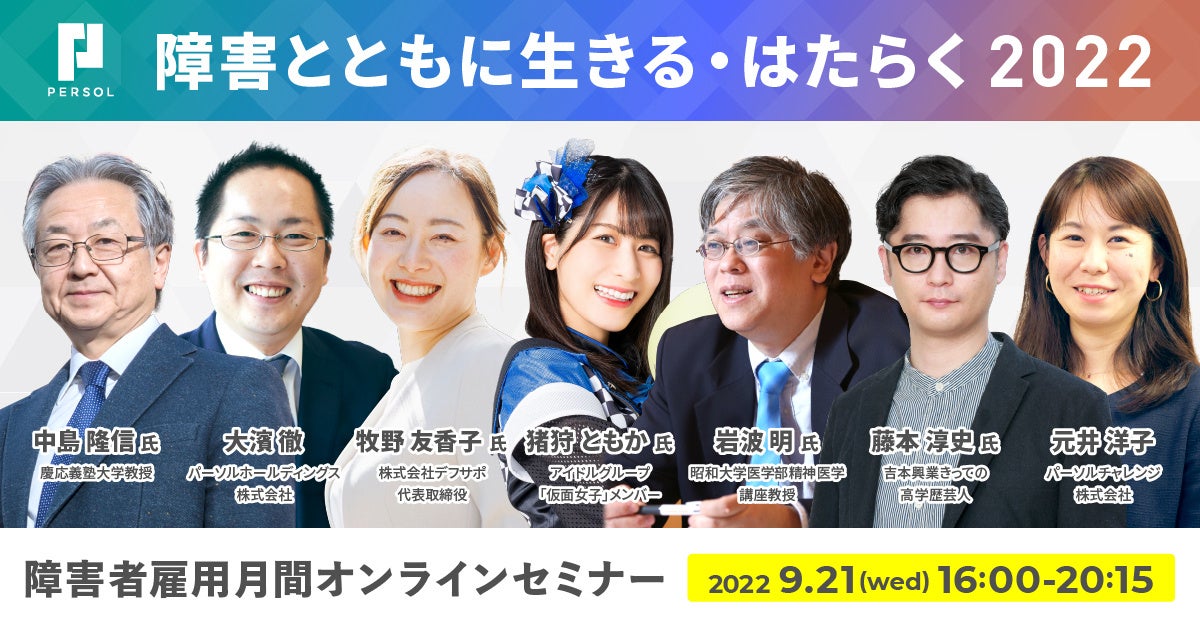 総合人材サービスのパーソルホールディングス株式会社(本社:東京都港区、代表取締役社長 CEO:和田孝雄)は、はたらき方やはたらく価値観が多様化する今、障害の有無に関わらず、あらゆるはたらく個人がより幸せに生き、自分らしくはたらくための一歩を踏み出すきっかけづくりを目的として、2022年9月21日(水)に無料の特別オンラインセミナー『障害者雇用支援月間に考える、障害と共に生きる・はたらく2022』を開催します。