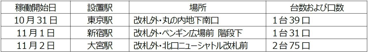 ・下記3駅への設置を皮切りに、今年度内には首都圏駅構内に約100台(約3,000口)を設置します。
