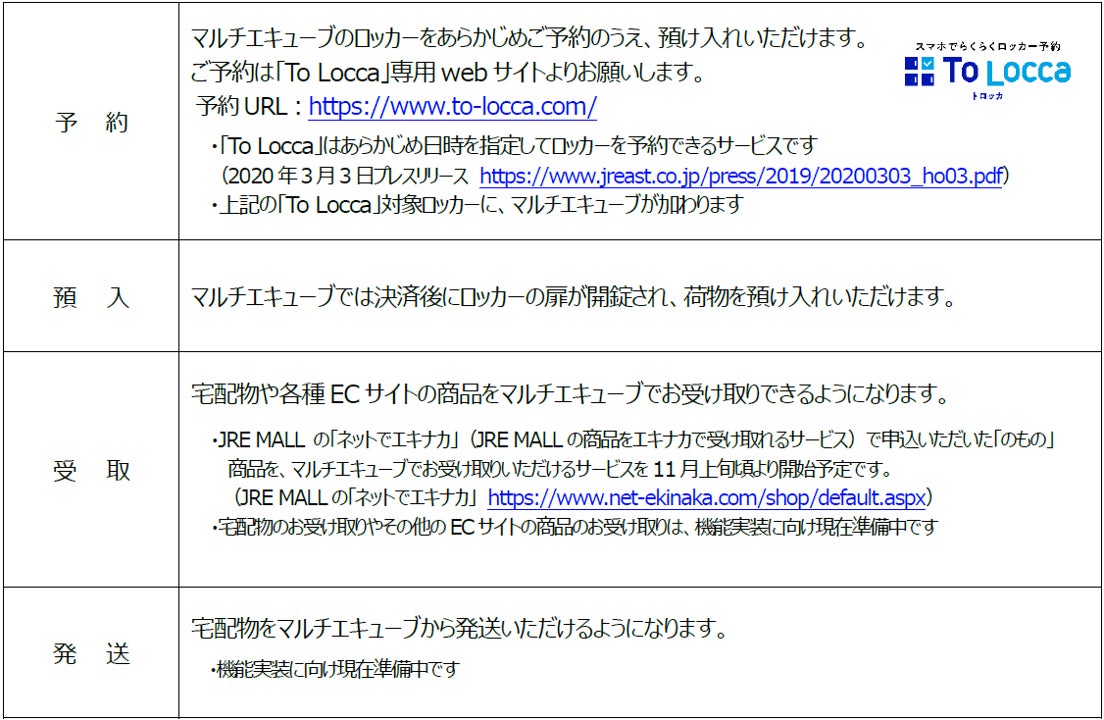 多機能を指す「マルチ」、「エキ(駅)」、ロッカーのボックスが「キューブ」であることから、サービス名称を「マルチエキューブ」としました。