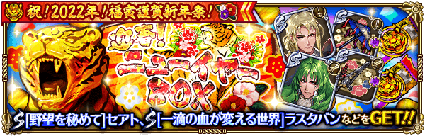 ニューイヤーBOXガチャチケット[期間限定]を集めてイベントBOXガチャに挑戦すると、S[野望を秘めて]セアトやS[一滴の血が変える世界]ラスタバン、福寅謹賀新年祭!自動再戦チケット[期間限定]などを獲得できます。