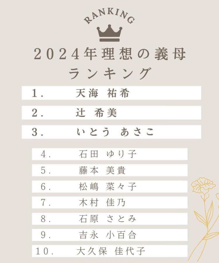5月12日は「母の日」2024年20~30代花嫁272名が選ぶ「理想の義母」芸能人ランキングTOP10をご紹介!