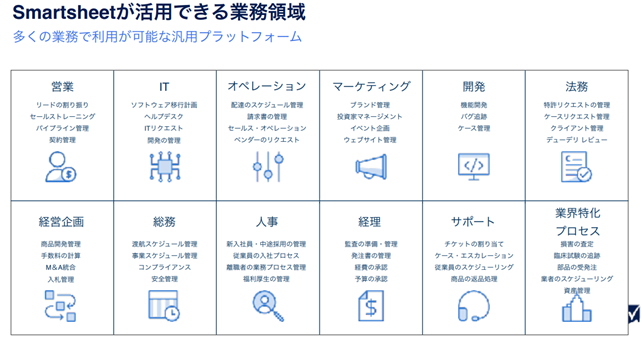 「Smartsheet」は、企業におけるプロジェクトやプロセスを効率的に管理するための、クラウドベースの業務管理プラットフォームです。タスクの追跡、スケジュール管理、チームでの共同作業など、さまざまな業務に対応し、直感的なインターフェースと柔軟なカスタマイズ機能により、個人のタスク管理から大規模なプロジェクトまで、幅広いニーズに対応できます。また、リアルタイムの進捗状況の共有や、タスクの優先順位の設定など、効率的な業務フローを実現します。さらに、リマインダーや通知機能も備えており、業務の見落としを防ぎます。セキュリティと統合性に優れ、使いなれたビジネスツールとも簡単に連携できます。「Smartsheet」を活用することで、チームの生産性を向上させ、プロジェクトの成功に貢献します。