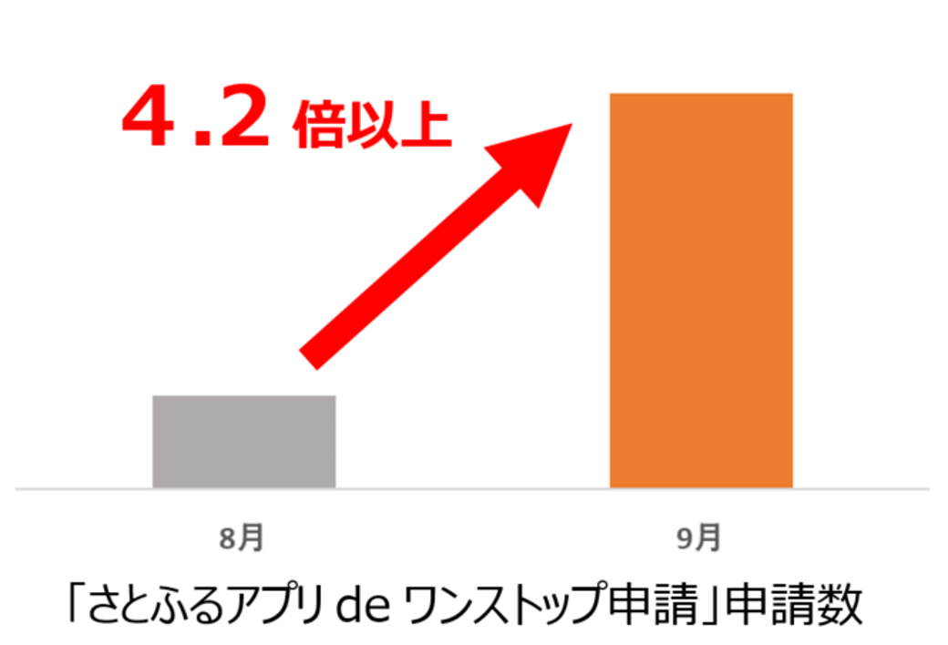 「さとふるアプリdeワンストップ申請」を利用した9月の寄付控除申請数は、前月比4.2倍以上に伸長しました。同時期の「さとふる」における寄付額は、前年比4.5倍以上に増加しており、10月1日のふるさと納税制度改正前に寄付を行い、「さとふるアプリdeワンストップ申請」を利用し、寄付控除申請までを完結させた方が多かったと推測されます。