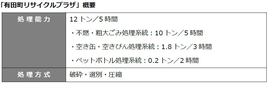 有田町リサイクルプラザは、三菱重工の設計・施工により1999年3月に完成。「不燃・粗大ごみ」、「資源ごみ(空き缶、空きびん、ペットボトル)」を処理・再資源化しており、施設全体の処理能力は5時間当たり12トンです。