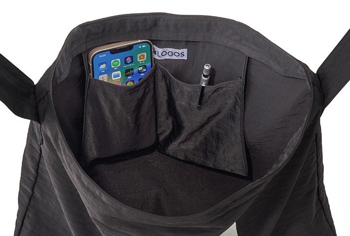 内側には財布とスマホが入るポケットを搭載。A4ファイルが収納でき、メインバッグとしても使える十分な容量。