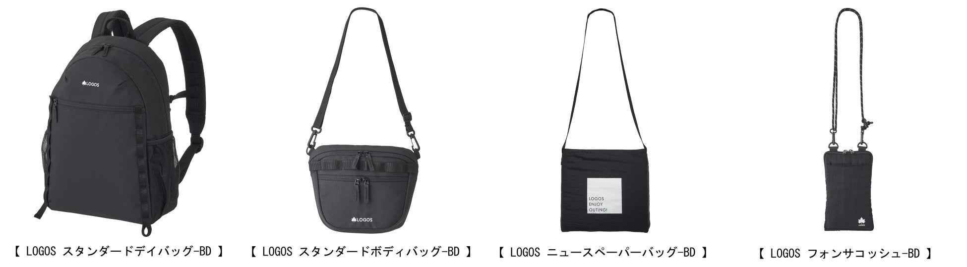 本アイテムは、男女問わずデイリーに使いやすいLOGOS定番バッグ「 LOGOS スタンダードデイバッグ-BD」、アクティブシーンからデイリー使いに最適な定番のボディバッグ「 LOGOS スタンダードボディバッグ-BD」、A4ファイルが収納できるサイズ感で、財布とスマホが入る内ポケット付きの「LOGOS ニュースペーパーバッグ-BD」、スマートフォン、サングラスなどの小物収納に便利な「LOGOS フォンサコッシュ-BD」の4種類をラインアップしています。