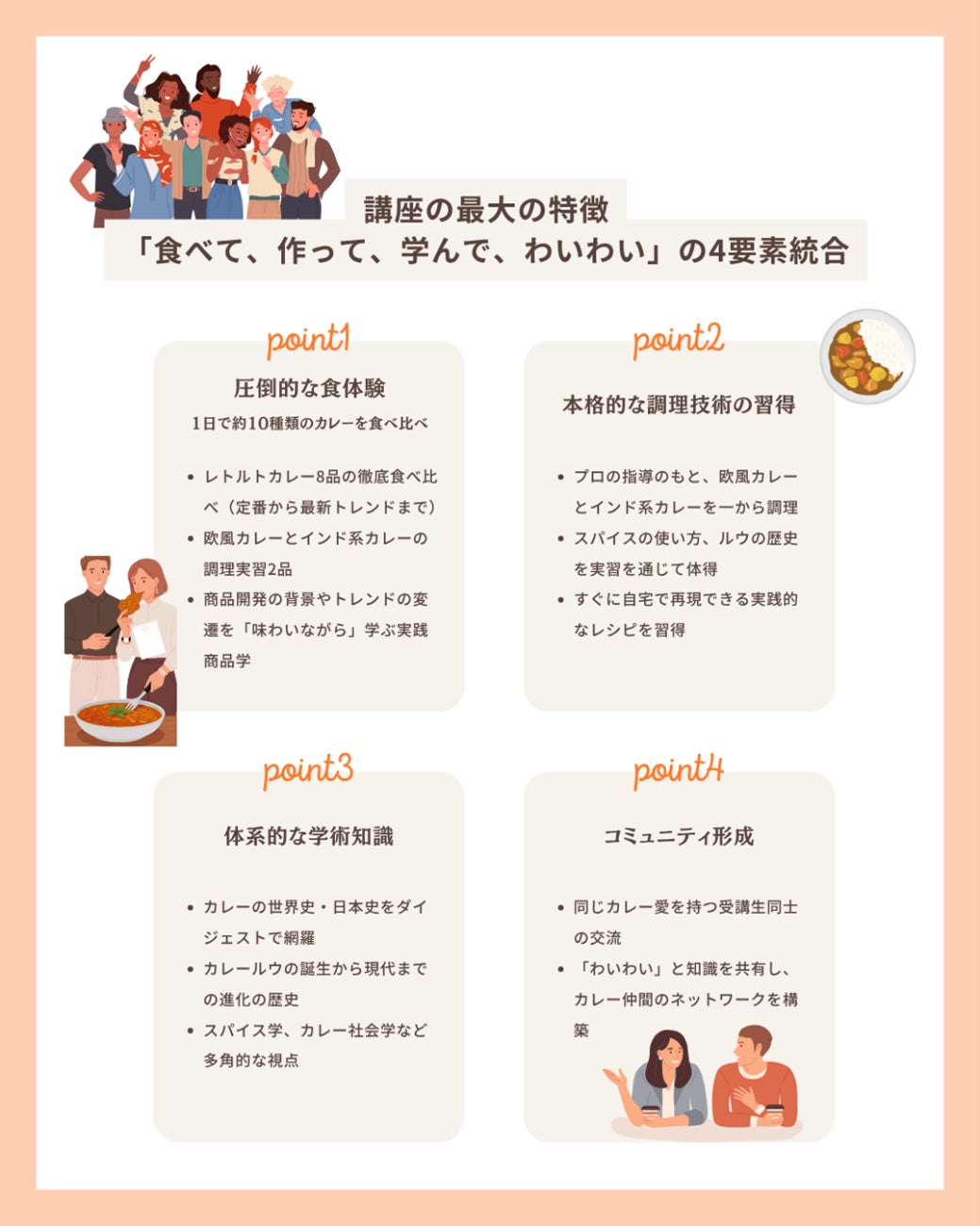 カレー大學では、こうした学習意欲の高いカレーファンや飲食業界関係者に向けて、調理実習と学術知識を融合させた日本初の本格的なカレー総合講座を企画。たった1日の集中プログラムで、受講者を「カレーを語れる専門家」へと導きます。