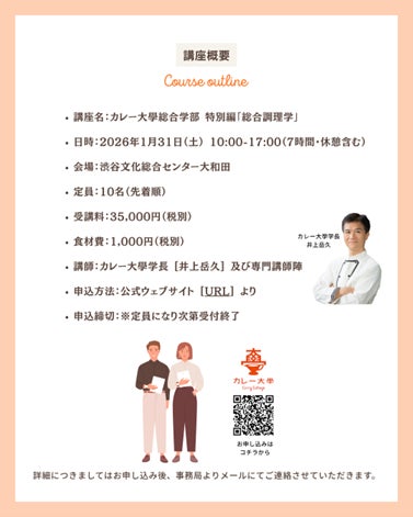 カレーの専門教育機関である株式会社カレー総合研究所(東京都渋谷区、代表:井上岳久)は、カレーを「調理」「歴史」「商品学」「社会学」の4領域から総合的に学ぶ特別講座「カレー大學総合学部 特別編『総合調理学』」を2026年1月31日に渋谷で初開講いたします。