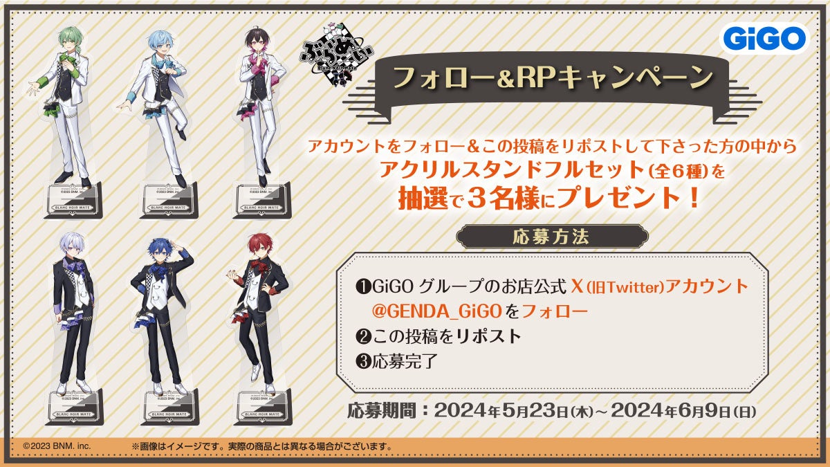 X(旧Twitter)アカウント(https://twitter.com/GENDA_GiGO )をフォローの上で、該当の投稿をリポストされたお客さまの中から抽選で3名様に「アクリルスタンドフルセット(全6種)」をプレゼントいたします。