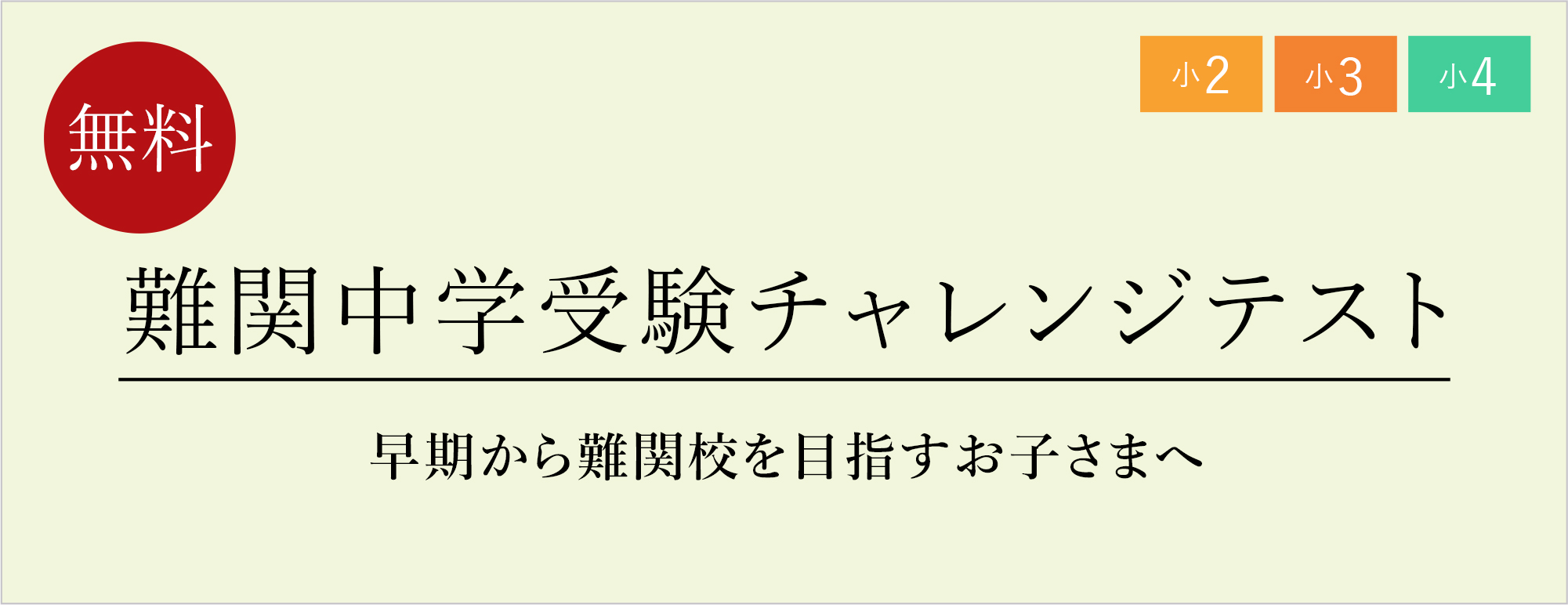 早期から難関中学進学を目指す小学2・3・4年生のお子さまを対象にしたテストです。1都3県の限定教室で開催します。問題は、難関中学の出題形式やレベルに合わせた難度が高い問題を出題します。単純な正答率だけではなく、解法のプロセスをしっかり理解し、答えを導き出しているかを測定できます。お子さまの現在の学習状況と今後の課題を知る絶好の機会です。