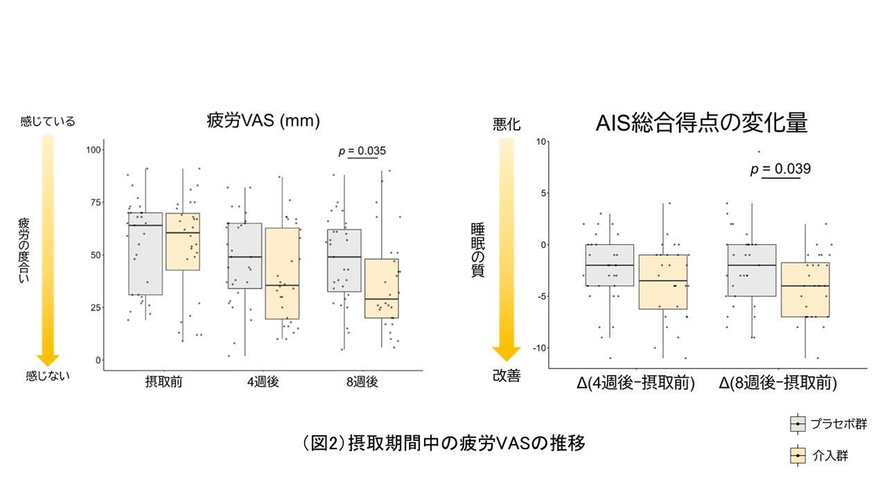 8週間摂取後、介入群ではプラセボ群と比較して疲労VASが有意に低値を示しました(図2)。